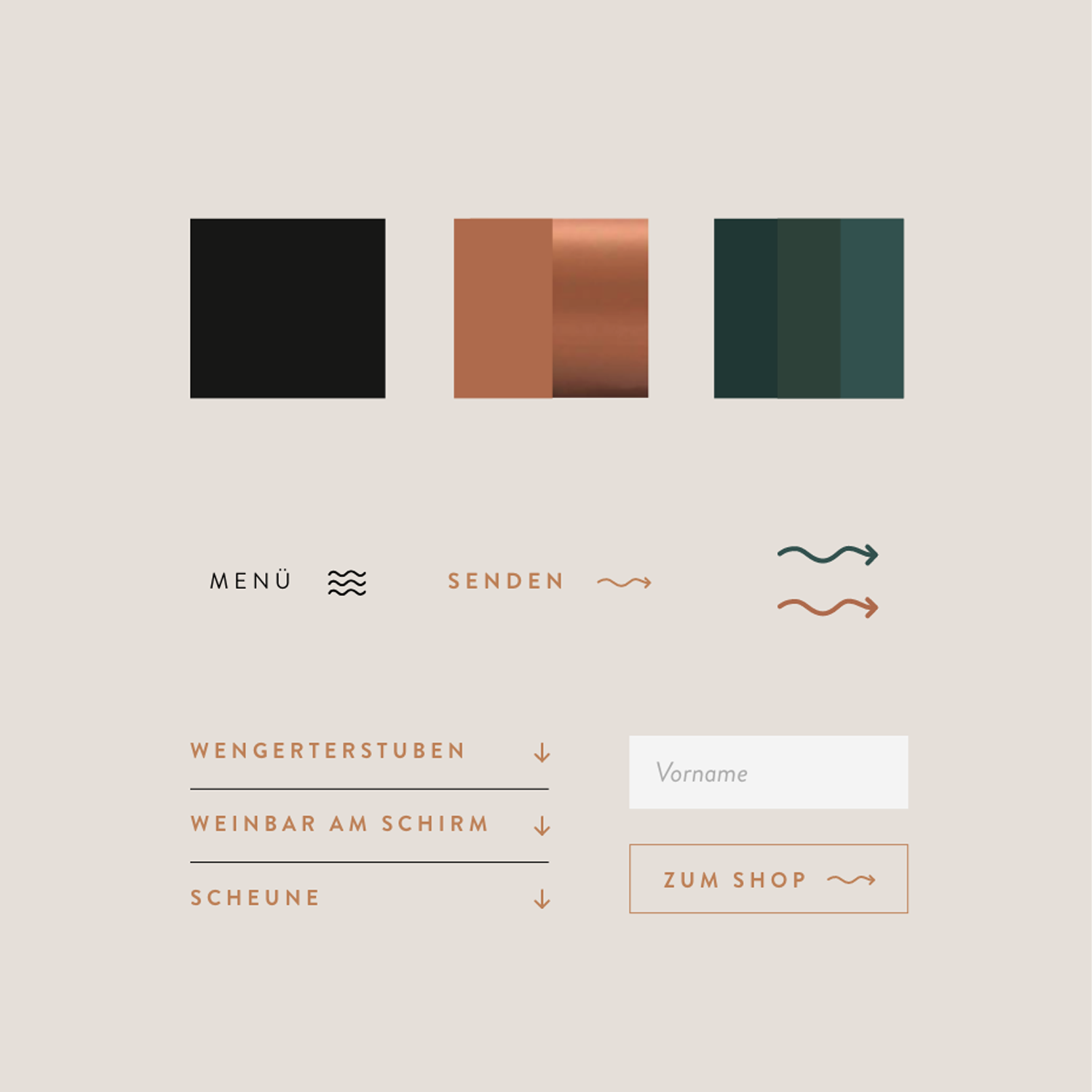 Im Zentrum steht ein quadratisches Logo mit vier Buchstaben – reduziert, aber einprägsam. Farblich dominiert ein Mix aus Kupfer und dunklem Grün, inspiriert vom Weinberg „Kupferhalde“. Eine Symbolwelt aus Icons (Trauben, Luftschlange, Zunge) bringt die Inhalte auf den Punkt – vom Etikett bis zur Rebsortentafel. Auch die Bildwelt und Website wurden konsequent im neuen Stil umgesetzt. Das Ergebnis ist ein Auftritt, der Wiedererkennbarkeit schafft, ohne sich aufzudrängen – und der dem Weingut den Raum gibt, das zu zeigen, was es wirklich ist: ein Ort mit eigenem Charakter und offenen Türen.