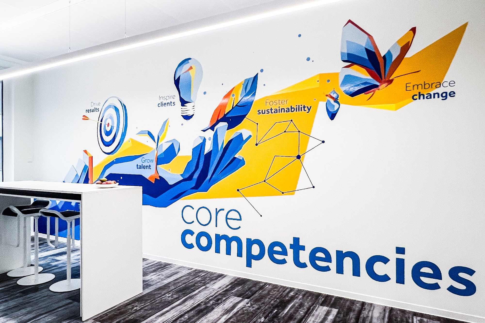 Im Foyer und im angrenzenden Flurbereich empfangen illustrierte Collagen die Besucher mit Exytes Pioniergeist und Historie. In den Mitarbeiterküchen und weiteren Flurbereichen erinnern die Values und Core Competencies als geometrische Grafiken täglich an das, wofür Exyte steht. Porträts des Teams unterstreichen die Vielfalt und machen die Menschen hinter der Technologie sichtbar. Für Bewerber wurden Motive entwickelt, die Neugier wecken und Exyte als modernen Arbeitgeber präsentieren.